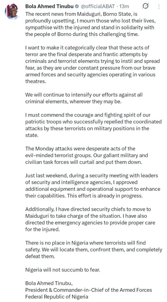“The recent news from Maiduguri, Borno State, is profoundly upsetting. I mourn those who lost their lives, sympathise with the injured and stand in solidarity with the people of Borno during this challenging time,” Tinubu stated.