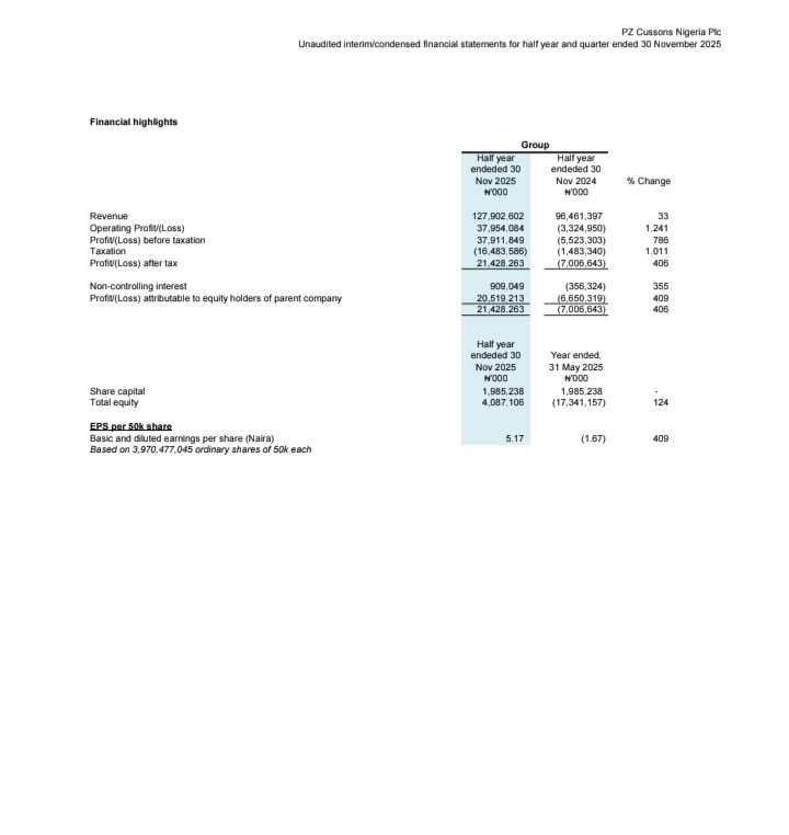 PZ Cussons Nigeria Plc has announced a remarkable financial recovery, posting a profit after tax of ₦20.5 billion for the half year ended November 30, 2025, compared to a loss of ₦7 billion in the same period last year.