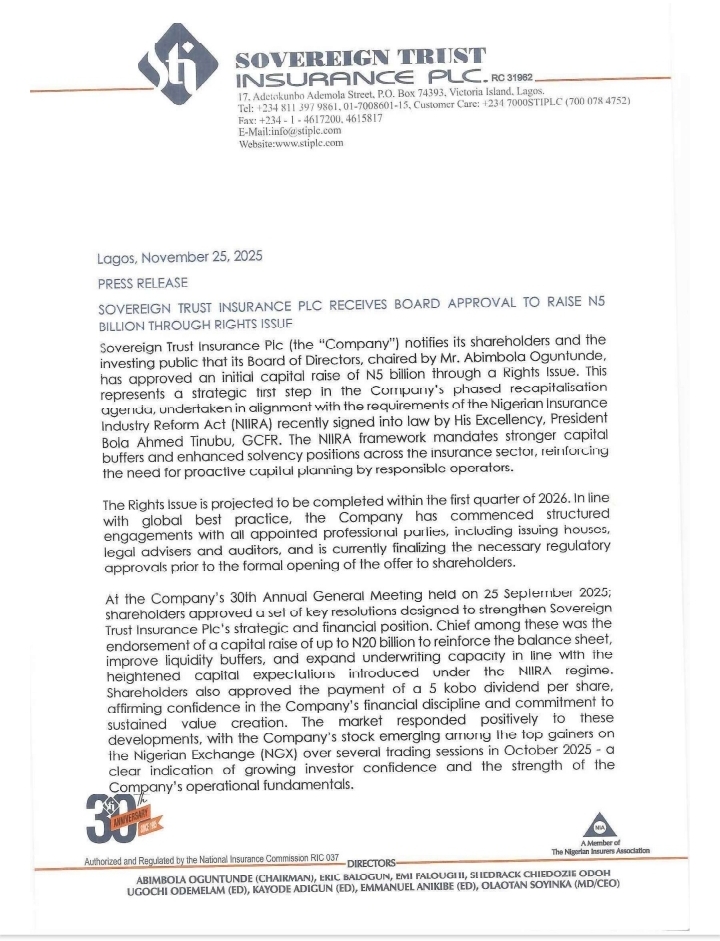 Sovereign Trust Insurance Plc has announced a significant step in its long-term recapitalisation strategy following the approval of a N5 billion Rights Issue by its Board of Directors. This marks the beginning of a phased effort to meet new regulatory requirements under the Nigerian Insurance Industry Reform Act (NIIRA).