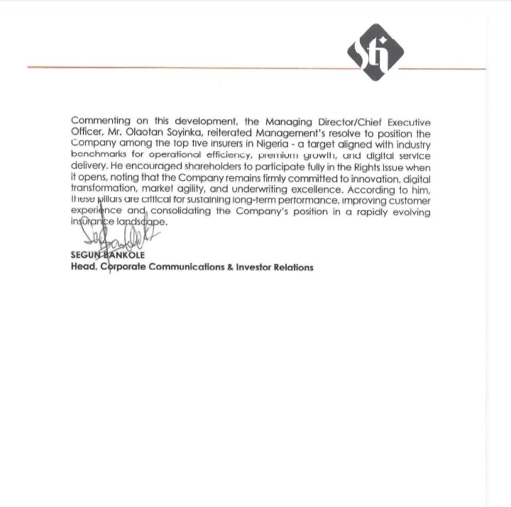 Managing Director/Chief Executive Officer, Mr Olaotan Soyinka, also commented on the developments. Bankole quoted him as reaffirming management’s commitment to repositioning the firm, stating that Soyinka “reiterated Management’s resolve to position the Company among the top five insurers in Nigeria, a target aligned with industry benchmarks for operational efficiency, premium growth, and digital service delivery.”